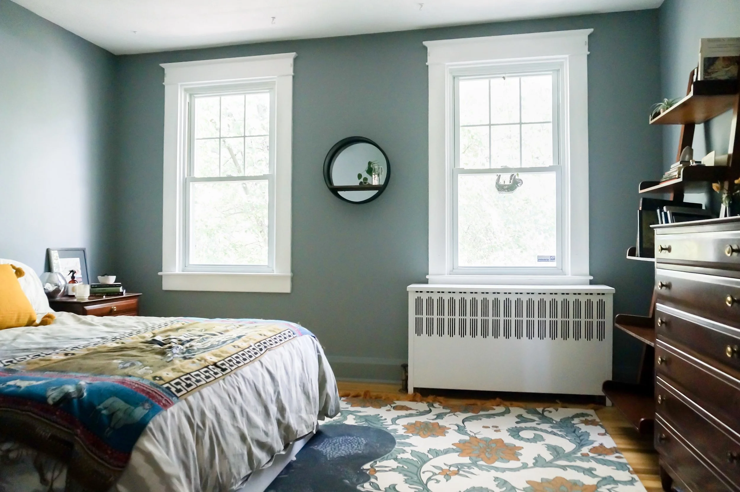 Lindsay and Kyle selected neutral colors, like this greyish blue in their guest bedroom, to highlight the charming details of their home.
