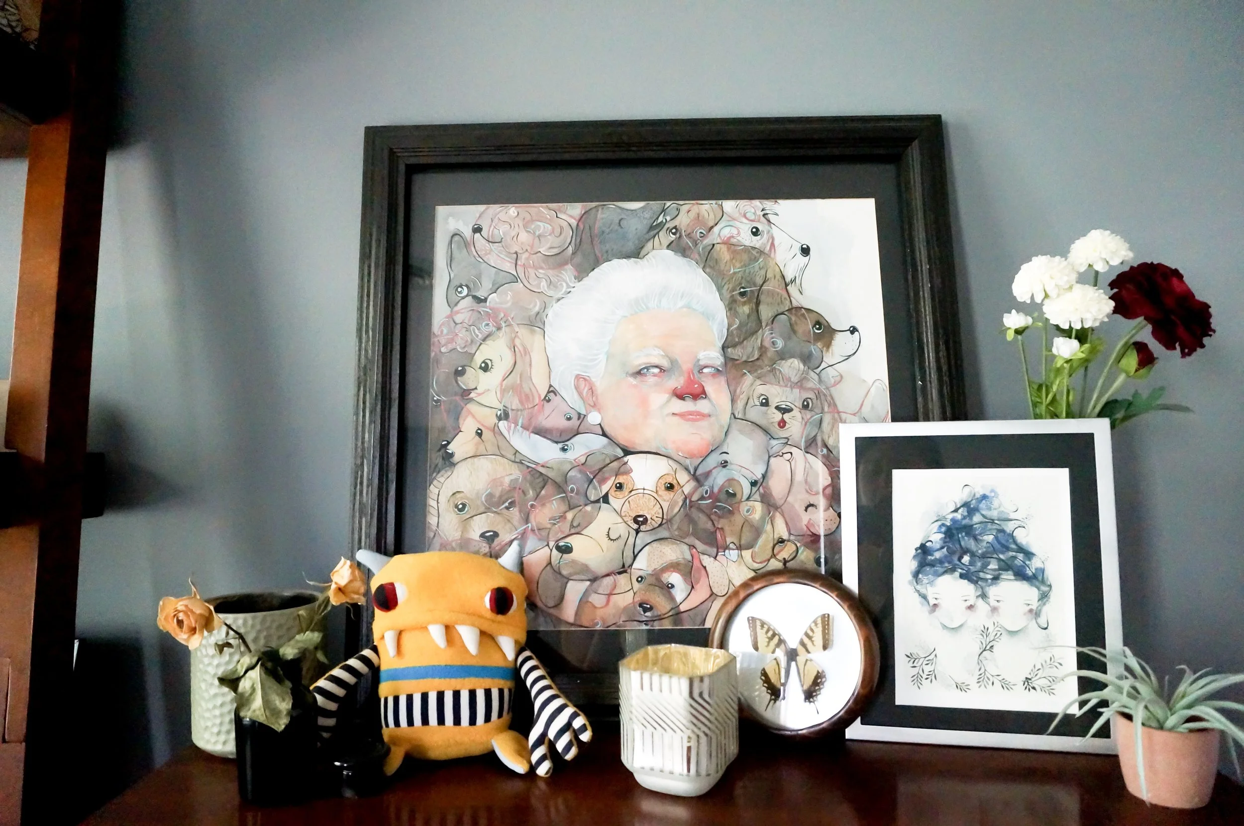 Kyle said his favorite is the horror head in the basement by local artist Alex Hagen. I’m having a really hard time deciding! I have envelopes that my Grandpop’s brother drew on when sending letters to his wife during the war. I hold those pretty close to my heart. I have them framed in my studio.
